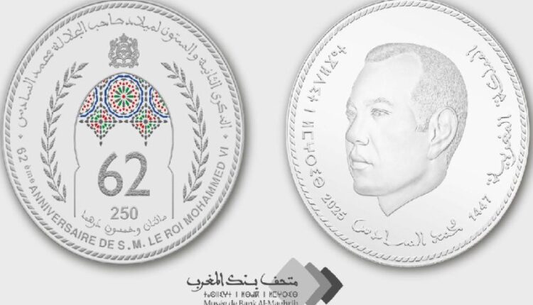 أصدر بنك المغرب قطعة نقدية تذكارية فضية من فئة 250 درهما، وذلك تخليدا للذكرى الثانية والستين لميلاد صاحب الجلالة الملك محمد السادس.