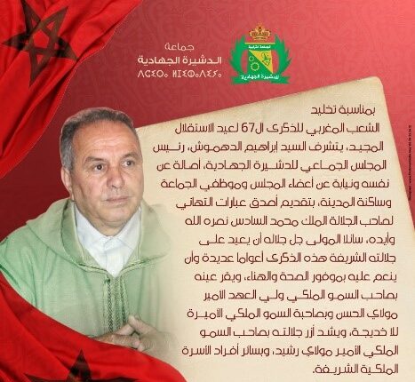تهنئة رئيس جماعة الدشيرة الجهادية بمناسبة الذكرى 67 لعيد الاستقلال Image الأول للأخبار نوفمبر 17, 2022 Share