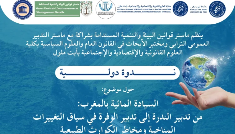 تحتضن كلية العلوم القانونية والاقتصادية والاجتماعية بأيت ملول، يومي 10 و11 أبريل 2026، أشغال ندوة دولية حول موضوع “السيادة المائية بالمغرب من تدبير الندرة إلى تدبير الوفرة في سياق التغيرات المناخية ومخاطر الكوارث الطبيعية”، من تنظيم ماستر قوانين البيئة والتنمية المستدامة بشراكة مع ماستر التدبير العمومي الترابي ومختصبر الأبحاث في القانون العام والعلوم السياسية بالكلية، وبمشاركة ثلة من الأكاديميين والخبراء والمسؤولين المؤسساتيين.