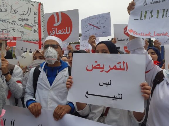 ورفع الطلبة شعارات من قبيل لا للتعاقد، لا للخوصصة، لافتين الانتباه إلى أن لا يتم إقرار تعويضات لفائدة الممرضين الذين يتدربون بالمستشفيات العمومية، بالإضافة إلى أنهم يقومون بالحراسة الليلية دون مقابل.