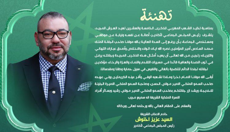 يتشرف خادم الأعتاب الشريفة، السيد عزيز أخنوش، رئيس الجماعة الترابية لأكادير، أصالة عن نفسه ونيابة عن باقي أعضاء الجماعة و ساكنة المدينة، بتقديم فروض الطاعة والولاء اللائقة بالمقام العالي بالله جلالة الملك محمد السادس نصره الله، بمناسبة حلول عيد العرش المجيد الذي يخلد الذكرى الخامسة و العشرين لاعتلاء جلالته عرش أسلافكه المنعمين.