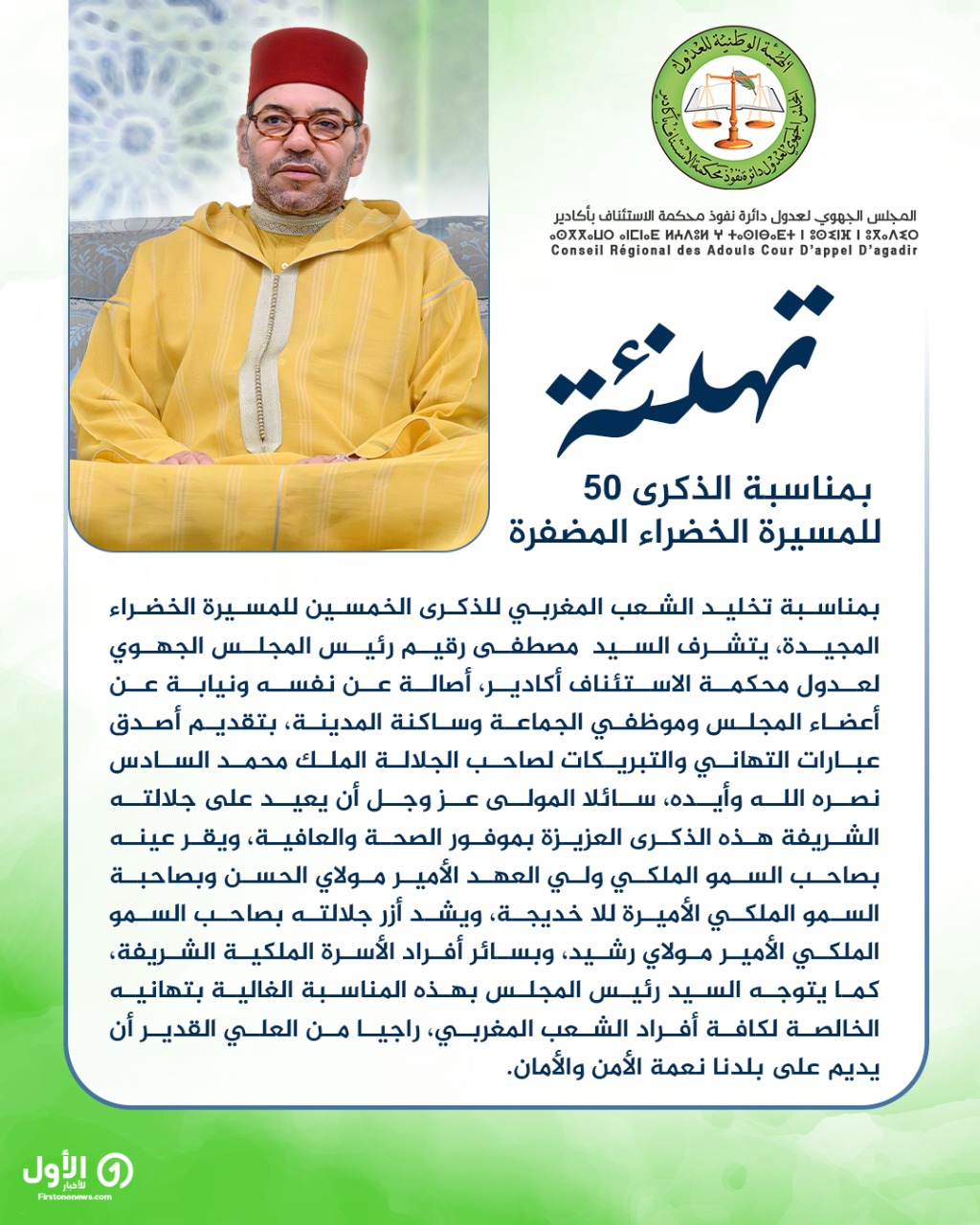 بمناسبة تخليد الذكرى الخمسين للمسيرة الخضراء المظفرة، يتشرف خديم الأعتاب الشريفة مصطفى رقيم، رئيس المجلس الجهوي لعدول نفوذ محكمة الاستئناف باكادير، بأن يرفع إلى السدة العالية بالله، الملك محمد السادس نصره الله، أسمى آيات التهاني وأصدق عبارات الولاء والإخلاص، سائلا المولى عز وجل أن يعيد هذه المناسبة الوطنية المجيدة على جلالته بموفور الصحة والعافية وطول العمر، وعلى بلدنا بمزيد من التقدم والرخاء والازدهار، في ظل القيادة الرشيدة لجلالته أدام الله عزه ونصره.