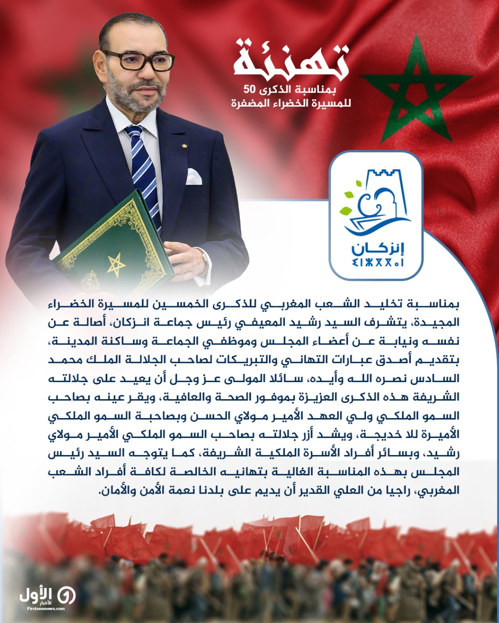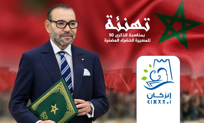 بمناسبة تخليد الذكرى الخمسين للمسيرة الخضراء المظفرة، يتشرف خديم الأعتاب الشريفة رشيد المعيفي، رئيس المجلس الجماعي لانزكان، بأن يرفع إلى السدة العالية بالله، الملك محمد السادس نصره الله، أسمى آيات التهاني وأصدق عبارات الولاء والإخلاص، سائلا المولى عز وجل أن يعيد هذه المناسبة الوطنية المجيدة على جلالته بموفور الصحة والعافية وطول العمر، وعلى بلدنا بمزيد من التقدم والرخاء والازدهار، في ظل القيادة الرشيدة لجلالته أدام الله عزه ونصره.