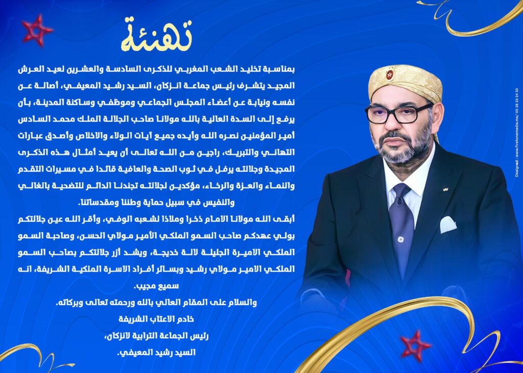 بمناسبة تخليد الشعب المغربي للذكرى السادسة والعشرين لعيد العرش المجيد يتشرف رئيس جماعة انزكان، السيد رشيد المعيفي، أصالة عن نفسه ونيابة عن أعضاء المجلس الجماعي وساكنة المدينة، بأن يرفع إلى السدة العالية بالله مولانا صاحب الجلالة الملك محمد السادس أمير المؤمنين نصره الله وأيده جميع آيات الولاء والاخلاص وأصدق عبارات التهاني والتبريك، راجين من الله تعالى أن يعيد أمثال هذه الذكرى المجيدة وجلالته يرفل في ثوب الصحة والعافية قائدا في مسيرات التقدم والنماء والعزة والرخاء، مؤكدين لجلالته تجندنا الدائم للتضحية بالغالي والنفيس في سبيل حماية وطننا ومقدساتنا.