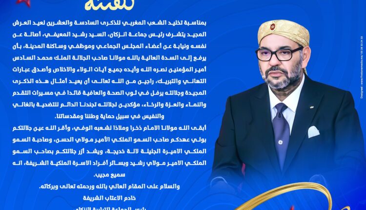 بمناسبة تخليد الشعب المغربي للذكرى السادسة والعشرين لعيد العرش المجيد يتشرف رئيس جماعة انزكان، السيد رشيد المعيفي، أصالة عن نفسه ونيابة عن أعضاء المجلس الجماعي وساكنة المدينة، بأن يرفع إلى السدة العالية بالله مولانا صاحب الجلالة الملك محمد السادس أمير المؤمنين نصره الله وأيده جميع آيات الولاء والاخلاص وأصدق عبارات التهاني والتبريك، راجين من الله تعالى أن يعيد أمثال هذه الذكرى المجيدة وجلالته يرفل في ثوب الصحة والعافية قائدا في مسيرات التقدم والنماء والعزة والرخاء، مؤكدين لجلالته تجندنا الدائم للتضحية بالغالي والنفيس في سبيل حماية وطننا ومقدساتنا.
