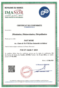 حصلت شركة FAST MOSK المغربية على شهادة المطابقة NM EN 16636v2018 في خدمات مكافحة الافات من قوارض وحشرات و زواحف و التطهير و المسلمة من المعهد المغربي للتقييس IMANOR . وهي شهادة حصلت عليها من بين أوائل الشركات بالمغرب .
