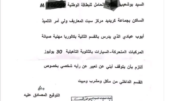 خلف انتشار التزام وقعه أحد أولياء التلاميذ لصالح مؤسسة تعليمية بسيدي بنور غضب رواد مواقع التواصل الاجتماعي، حيث ورد فيه أن الأب يلتزم “بأن يتوقف ابني عن تعبير عن رأيه شخصي بخصوص القسم الداخلي من مأكل ومشرب ومبيت”.
