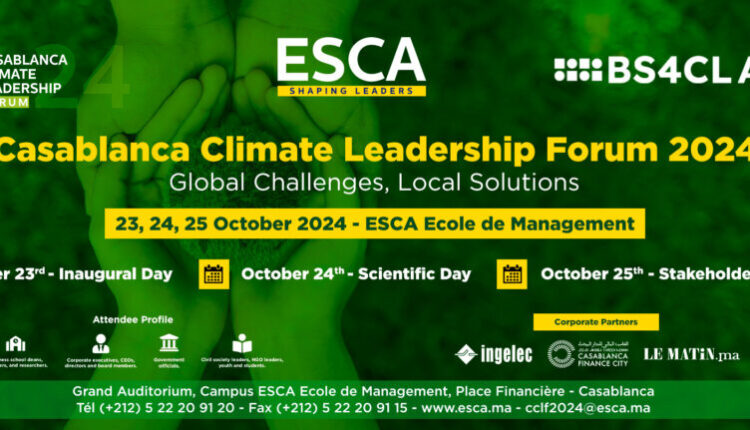 سينعقد منتدى القيادة المناخية بالدار البيضاء 2024 (CCLF)، وهو حدث هام، وجزء من مبادرة مدارس إدارة الأعمال للقيادة المناخية في إفريقيا (BS4CL Africa) ومنظم من طرف مدرسة الأعمال ESCA، من 23 إلى 25 أكتوبر الجاري في حرم مدرسة الأعمال، الواقع في قلب المركز المالي بالدار البيضاء CFC.