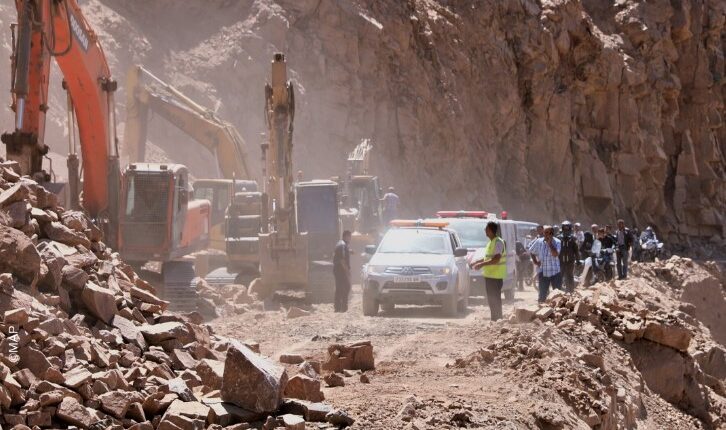 وزار الوفد الطريق الوطنية رقم 7 على مستوى النقطة التي تعرف توقفا كاملا بسبب الانهيارات المتواصلة للجبال والصخور، للوقوف على المجهودات المبذولة من طرف باقي المصالح لإزالة الصخور والأحجار وإصلاح ما يمكن إصلاحه لفتح المجال أمام سيارات العالقين وفرق الإنقاذ للوصول إلى ضحايا الزلزال في الجانب الآخر التابع لإقليم الحوز بجهة مراكش-آسفي.